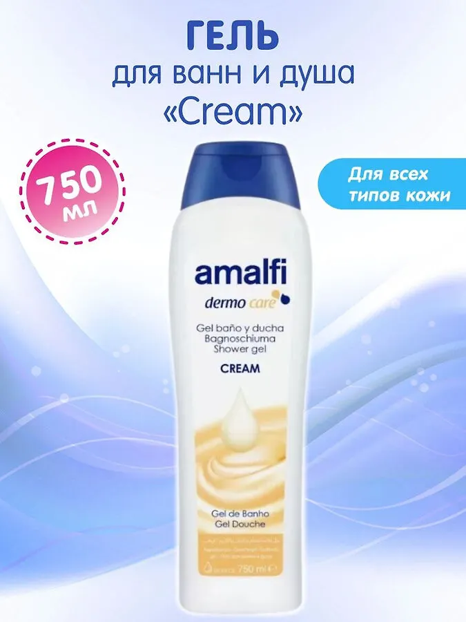 Крем-гель для душа AMALFI . Подходит для очищения и ежедневной гигиены тела. Кремовая текстура и мягкая пена в душе обволакивает ваше тело приятным ароматом. Подходит для всех типов кожи. Семейный формат.