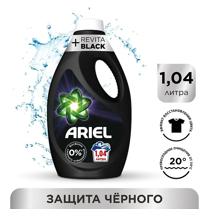 Жидкий гель-концентрат Ariel Защита Черного бережно отстирывает загрязнения на одежде, сохраняя яркость и восстанавливая цвет. Ариэль гель эффективен на коротких циклах стирки и беспощадно удаляет пятна и грязь. ПРЕИМУЩЕСТВА ГЕЛЯ ДЛЯ СТИРКИ ARIEL: - Превосходное удаление пятен с первой стирки даже при температуре 20C - Не оставляет следов на одежде - Сохраняет яркость черных и темных вещей на длительный срок- Возобновляет сияние чёрных и тёмных цветов - Дополнительная защита ткани благодаря технологии восстановления волокон- Содержит 0% черных красителей- Приятный аромат свежести