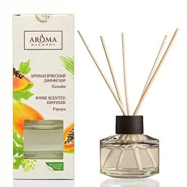 Ароматический диффузор AROMA HARMONY "Папайя" - это безопасный и экологически чистый способ ароматизации помещения, является прекрасной альтернативой ароматизированным спреям. Стильный дизайн этого модного ароматического аксессуара украсит любой интерьер. Изделие рассчитано на помещение до 15 м2. Срок службы арома диффузора от 1,5 до 2-х месяцев, в зависимости от места использования. Перед применением внимательно изучите текст на упаковке. Ноты аромата: фруктовый, папайя, персик, маракуйя, груша, нероли, ваниль, сандал, гелиотроп. Совет по использованию диффузоров AROMA HARMONY: Новые палочки должны напитаться раствором в течение суток, затем их нужно перевернуть. Для лучшей ароматизации, рекомендуем чаще переворачивать палочки. Максимальная интенсивность запаха достигается при переворачивании раз в сутки.