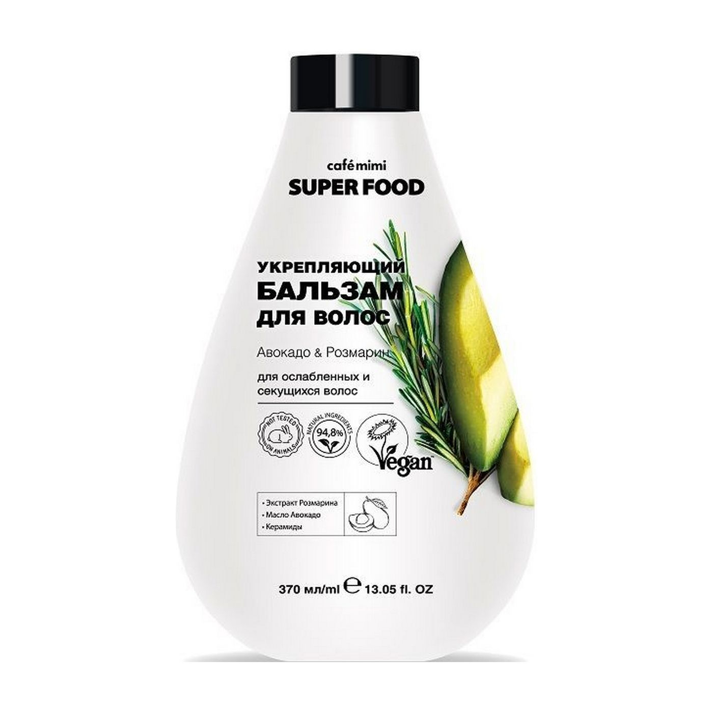 Укрепление от корней до кончиков. Предотвращение выпадения волос. Защита от секущихся кончиков. Бальзам для волос Укрепляющий Авокадо & Розмарин Cafe Mimi насыщает волосы жизненной силой, восстанавливает, делает более послушными, придает объем. Масло авокадо глубоко увлажняет и питает кожу, повышает эластичность, возвращает ей гладкость и упругость. Бальзам для волос глубоко питает и увлажняет волосы, устраняет ломкость и сечение кончиков, облегчает расчесывание, делает волосы мягкими, гладкими и эластичными. Экстракт Розмарина идеально увлажняет кожу головы и волосы, благодаря высокому содержанию витаминов С, Е и биотина бальзам укрепляет волосяные фолликулы.
