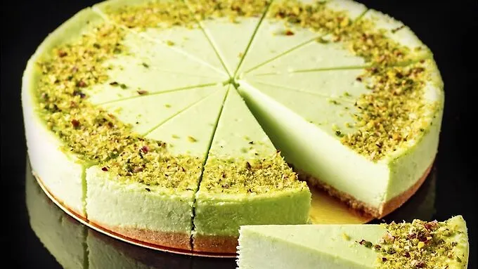Классический сливочный чизкейк на основе коржа из песочного печенья и нежной творожной массы с ярко-выраженным вкусом фисташки, покрытой глянцевым топпингом из сочной белой глазури, декорирован насыщенной дробленой крошкой фисташки, зеленый цвет которой, контрастирует на глянцевой текстуре чизкейка.