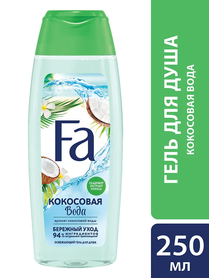 С ухаживающим и освежающим гелем для душа Fa Кокосовая вода можно побаловать свои чувства вдохновляющими ароматами путешествий. Дари себе фантастическое наслаждение каждый день! Почувствуй невероятную свежесть кокосовой воды в сочетании с цветочными нотами, пробуждающими чувства во время душа. Обогащенный натуральным экстрактом кокоса, гель для душа перенесет тебя в настоящее тропическое путешествие. Нежная и свежая формула окутает кремовой пеной, которая защитит кожу от пересушивания и подарит ей приятное ощущение мягкости. Без минеральных масел, pH-нейтральный, хорошая переносимость кожей дерматологически подтверждена.