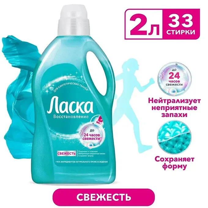 Гель для стирки Ласка Уход и Свежесть разработан специально для современных синтетических тканей. Средство Ласка создано на основе технологии Deo-Fresh, которая эффективно заботится о свежести и чистоте вещей. - Гель Ласка Уход и Свежесть справляется с любыми загрязнениями на одежде, сохраняет аккуратный вид вещей в течение многих стирок. - Средство для стирки не только нейтрализует неприятный запах на ткани, но и поддерживает свежесть до 24 часов благодаря действию специальных отдушек. - Гель сохраняет форму ткани и поддерживает эластичность волокон. - Средство подходит для современных мембранных тканей с функцией дыхания и защиты от ветра и дождя. -Ласка подходит для стирки изделий из любых видов ткани (кроме шерсти и шёлка) в стиральных машинах-автоматах и ручной стирки в воде любой жёсткости.