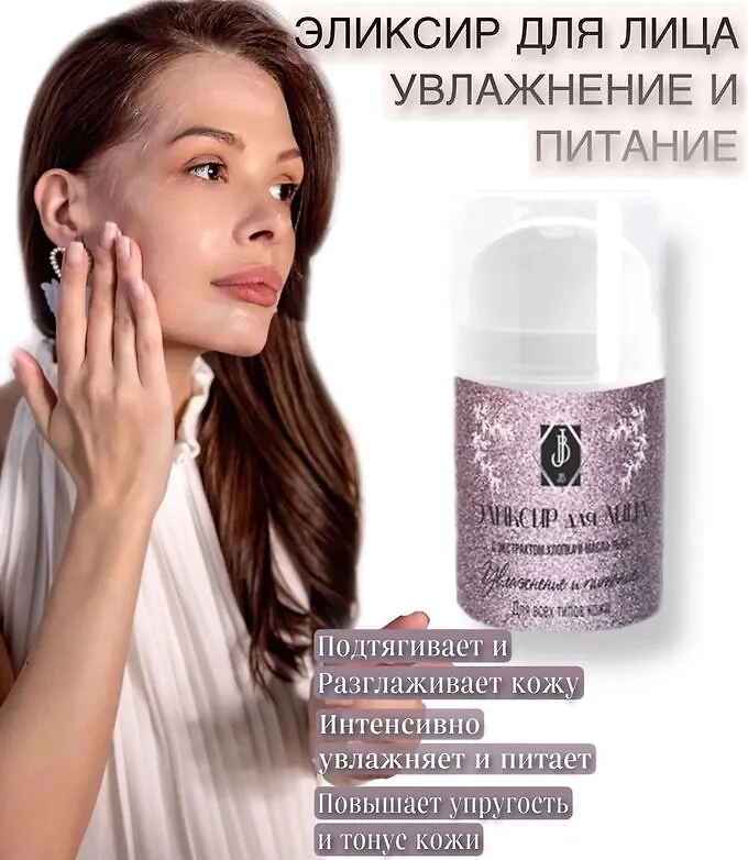 Эликсир для лица Увлажнение и питание для нормальной и обезвоженной кожи. Отсутствие баланса питательных веществ приводит к обезвоживанию, сухости и появлению морщин. За счёт 100% натурального состава эликсир интенсивно увлажняет, подтягивает и разглаживает кожу, наполняя её необходимыми витаминами и микроэлементами. Экстракт хлопка снимает раздражение, придаёт мягкость, комфорт и легкость. Масло льна содержит высокую концентрацию витамина E, которое способствует регенерации кожи, восстанавливает защитный барьер с помощью жирных кислот, а также предотвращает пересыхание и шелушение.