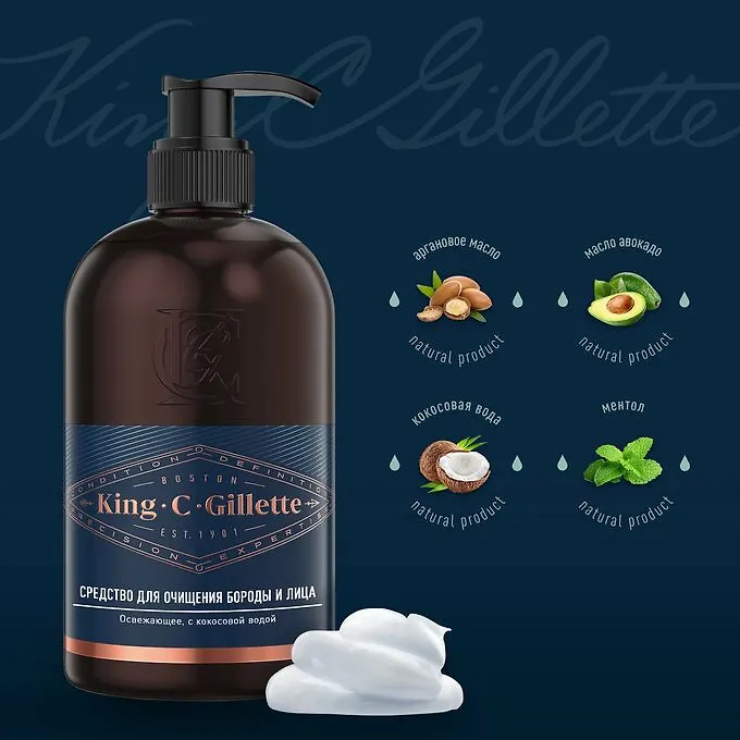 Линейка King C. Gillette объединила в себе всю экспертизу и инновации, накопленные за столетие, и названа в честь основателя нашей компании: Кинга К. Жиллетта. Средство для очищения бороды и лица King C. Gillette с кокосовой водой, аргановым маслом и маслом авокадо очищает и питает бороду, а также делает кожу чистой и придает ей свежесть на весь день."