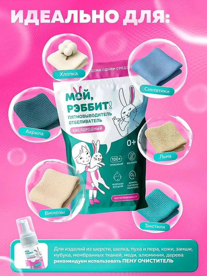 НЕ используйте средство для изделий из шерсти, шелка, пуха и пера, кожи, замши, нубука, мембранных тканей, меди, алюминия, дерева. НЕ смешивать со средствами содержащими хлор. Перед очисткой поверхностей, мягкой мебели и ковров проверьте совместимость пятновыводителя с обрабатываемой поверхностью на небольшом незаметном участке.