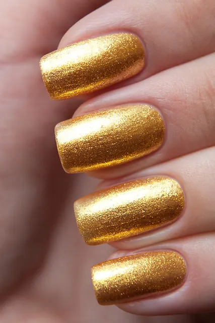 Текстура этого лака аналогична предыдущему, но шиммер в нем чуть крупнее и золотого цвета.