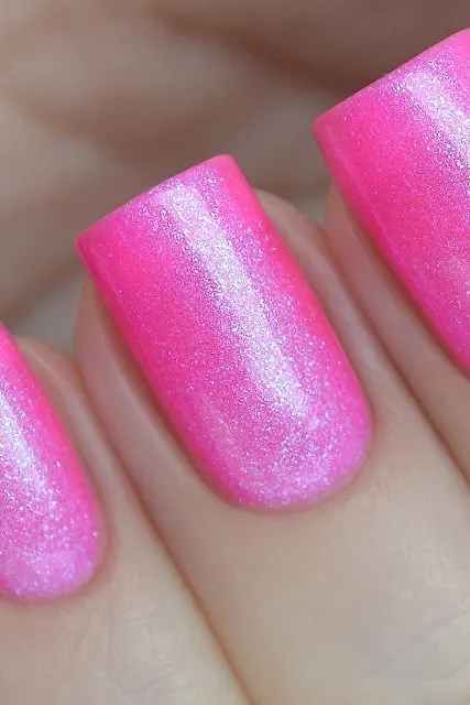 Розовое почти неоновое желе с добавлением голубого крупного шиммера, требует не менее трех слоев.