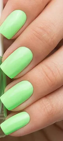 Неоновый зелёный крем на белой базе. После высыхания глянец чуть тускнеет, но не исчезает полностью