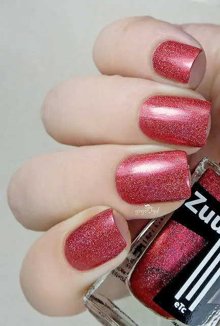 Очень насыщенный розовый голографик с добавлением бронзового пигмента, который придаёт лаку более тёплый оттенок.