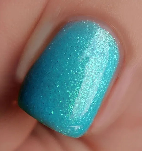Голубой лак с зелёным подтоном, который особенно хорошо заметен благодаря дуохромному шиммеру, меняющему цвет с зелёного на розово-фиолетовый. Текстура у лака неплотная и для того, чтобы полностью перекрыть линию улыбки, понадобится три слоя, но если лёгкая полупрозрачность не пугает, то можно обойтись и двум/ лучший лак для педикюра этого лета