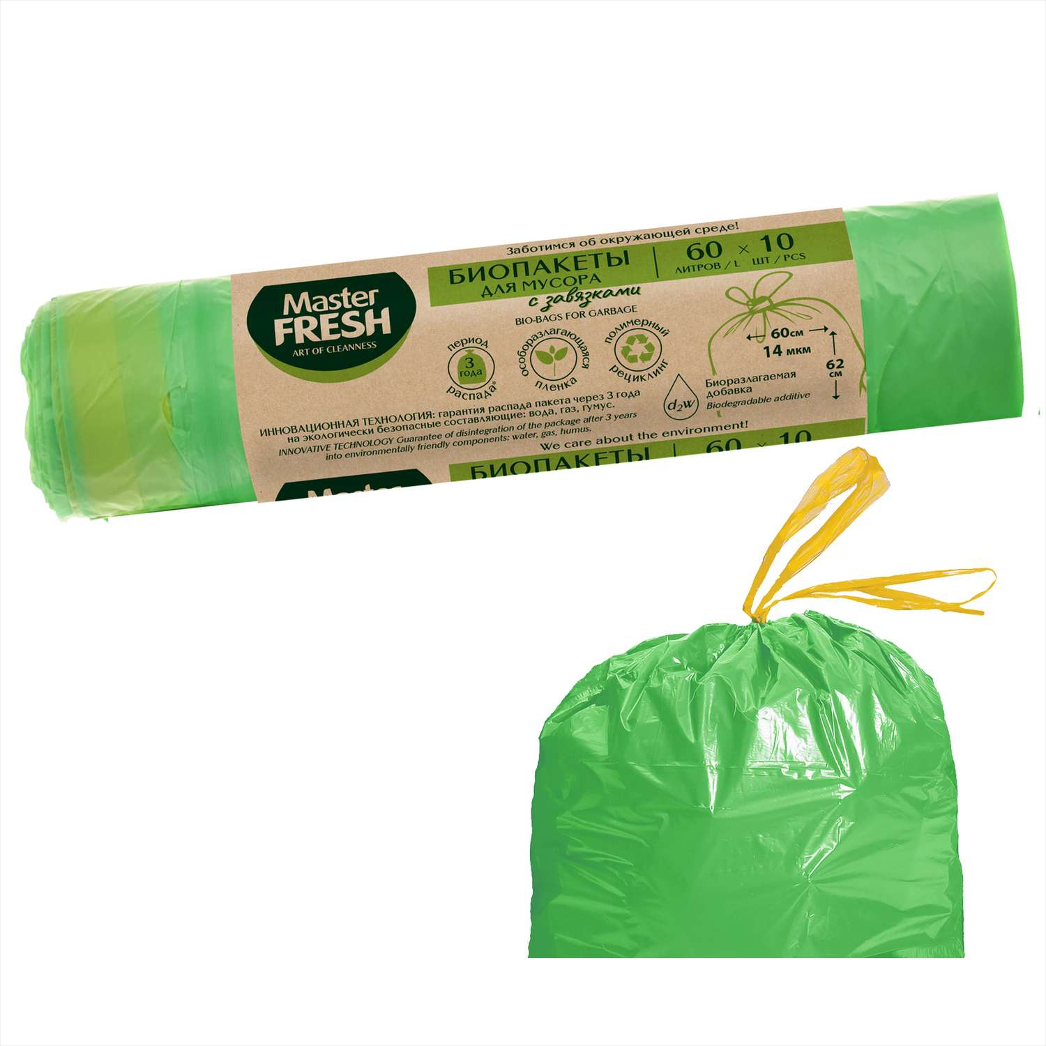 Master FRESH БИОпакеты для мусора с завязками 60л 10шт биоразлагаемые (салатовые) 14мкм