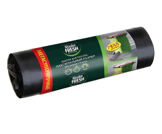 Пакеты для мусора Master FRESH Максимальный размер суперпрочные большого литража обладают высокой прочностью. При отрыве пакет легко отделяется от рулона и равномерно распределяет груз мусора. Пакеты отлично защищают от грязи и неприятного запаха, препятствуют проникновению насекомых. Идеально подходят для: больших бачков, генеральной уборки, дачных работ, субботников, пикников на природе.
