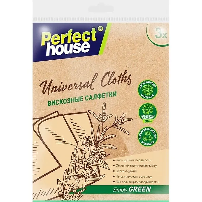 Салфетки хозяйственные Eco line Universal Cloths от торговой марки PERFECT HOUSE вискозные повышенной прочности отлично впитывают влагу, хорошо собирают пыль, абсорбируют грязь. Предназначены для уборки во всех помещениях квартиры и подходят для любых поверхностей. Плотные и крепкие универсальные салфетки для уборки не меняют форму и не растягиваются в процессе использования. Не оставляют ворса. Хозяйственные салфетки Universaal Cloths торговой марки Perfect House серии Eco Line большого размера – 32х38 см, служат дольше более тонких аналогов благодаря повышенной плотности и высокому содержанию вискозы. Можно стирать при температуре до 60! Вискозные салфетки для уборки станут незаменимыми помощниками для Вашего дома! Perfect House - эксперт в деталях.