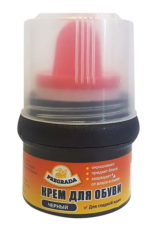 PREGRADA крем для обуви, банка с губкой (ЧЕРНЫЙ ) Крем предназначен для обуви из гладкой кожи и кожзаменителя. Крем обеспечивает эффективный уход за обувью, обновляет цвет и закрашивает потертости. Благодаря губке-аппликатору, средство удобно в использовании, исключается соприкосновение рук с кремом.