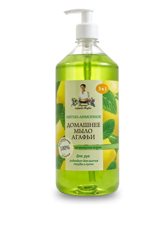 Домашнее мыло Агафьи 3 в 1 «Мятно-лимонное» 1 литр создано с учетом трех особенностей: эффективность, чистота и безопасность. Мыльный корень — натуральная, хорошо пенящаяся основа, безопасная и мягче щелочной, применяемой в обычном мыле. Питательные эфирные масла мяты и лимона бережно ухаживают за кожей рук, позволяют использовать очищающее средство не только для ежедневного мытья посуды, фруктов и овощей, уборки рабочих кухонных поверхностей, но и для ухода за кожей рук. Жидкое мыло большого объема 1л с удобным дозатором, вкусным мятным и цитрусовым, лимонным ароматом подходит на каждый день для всей семьи. Экологичные хоз товары — хорошая идея, что можно подарить женщине, маме и любимой бабуле на 8 Марта или просто так, без повода. Универсальная бытовая химия с органическими био компонентами — настоящая находка для загородного дома и дачи. Незаменима в хозяйственных целях. Легко смывается, не оставляет разводов. Косметика и хозтовары эко бренда «Рецепты бабушки Агафьи» не содержат парабенов. Eco и vegan, не тестируются на животных.