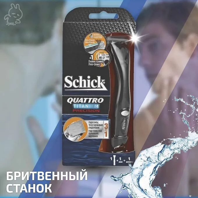 Бритвенный станок Schick Quattro Titanium Precision бреет, подравнивает и моделирует! Для бритья - четыре лезвия с титановым покрытием тщательно бреют кожу, а защитная решетка предотвращает возможность появления порезов. Для подравнивания - лезвие-триммер позволяет подравнивать труднодоступные зоны. Для моделирования - уникальный тример на оборотной стороне ручки с удобным регулируемым до нужной длины гребнем позволяет экспериментировать со своим образом и поддерживать в порядке бороду, усы и бакенбарды. Бритвенный станок работает от батарейки типа ААА, входит в комплект.