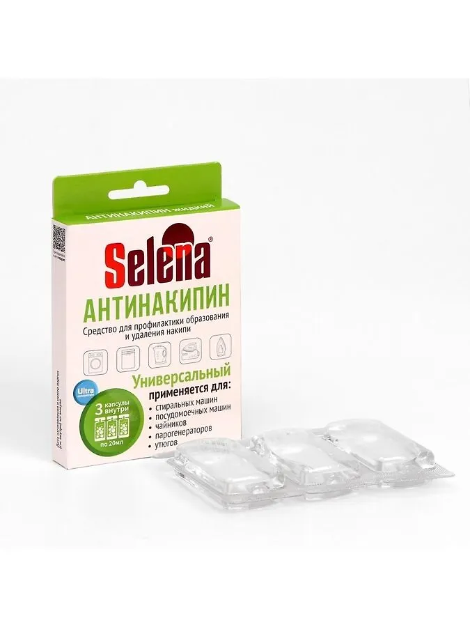 Антинакипин Selena жидкий универсальный концентрат 3 капсулы по 20 мл. Предназначено для удаления известкового налёта (накипи) в стиральных и посудомоечных машинах, допускающих, согласно инструкции, применение кислотосодержащих компонентов. Экономит электроэнергию.
