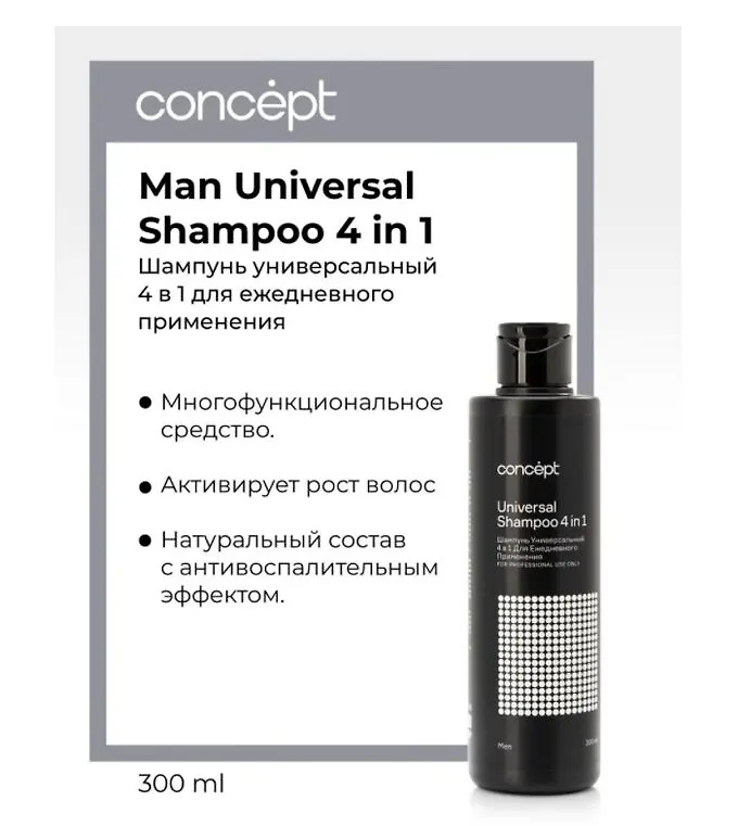 Этот универсальный профессиональный шампунь для ежедневного применения от российской марки Concept — идеальный комплексный мужской уход. Разработан с учетом всех биологических особенностей мужских волос и кожи головы.