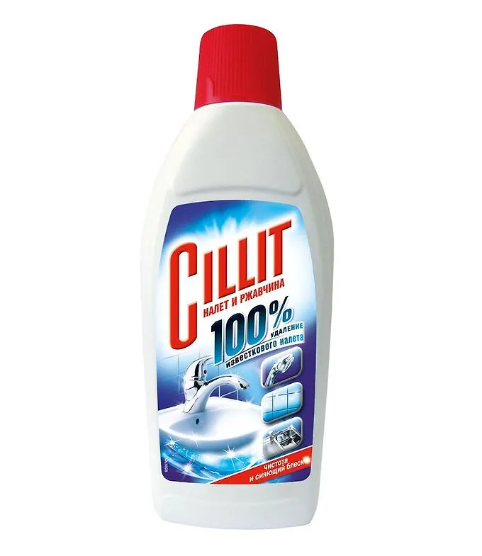 Чистящее средство Cillit для удаления известкового налета и ржавчины. Удаляет 100% известкового налета