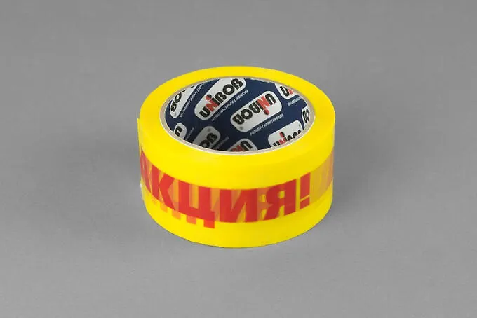 Скотч жёлтый 5смх66м с красным логотипом "Акция"