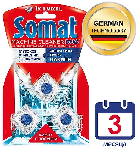 Очиститель для посудомоечной машины сомат Machine Cleaner специально разработан для использования в посудомоечной машине вместе с посудой. Его мощная формула с двойным действием DUO не только борется с жиром, тусклостью, неприятным запахом и загрязнениями, но также обладает экстра силой против накипи. Новый Somat Machine Cleaner для идеальной чистоты Вашей посудомоечной машины! Очиститель для посудомоечной машины Somat эффективно борется с остатками жира и накипи: На стенках посудомоечной машины На разбрызгивателях На фильтре В насосе В сливной трубе Просто положите одну капcулу, не нарушая целостность водорастворимой пленки очистителя для посудомойки Somat на дно загруженной посудомоечной машины и запустите её при обычной мойке вместе с посудой. Используйте очиститель для посудомойки Somat Machine Cleaner один раз в месяц