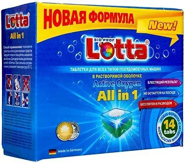 Таблетки Lotta в растворимой оболочке, изготовлены по новым технологиям, рекомендуются для использования в посудомоечных машинах ведущих производителей. Одна таблетка полностью обеспечивает весь цикл мытья и ополаскивания посуды и гарантирует ее кристальную чистоту. Специальные компоненты, входящие в состав формулы, не только эффективно удаляют даже стойкие загрязнения, но и защищают стеклянную посуду от повреждения и коррозии, придают блеск стали и серебру и поддерживают гигиеническую свежесть вашей машины. Таблетки Lotta созданы на растительной и минеральной основе: водорастворимая упаковка, не оставляет химикатов на посуде, без резкого запаха, безопасны для беременных женщин, не содержат нефтепродуктов, что обеспечивает их полную биоразлагаемость. Водорастворимая упаковка дает возможность избежать контакта кожи рук с химическими элементами таблеток.