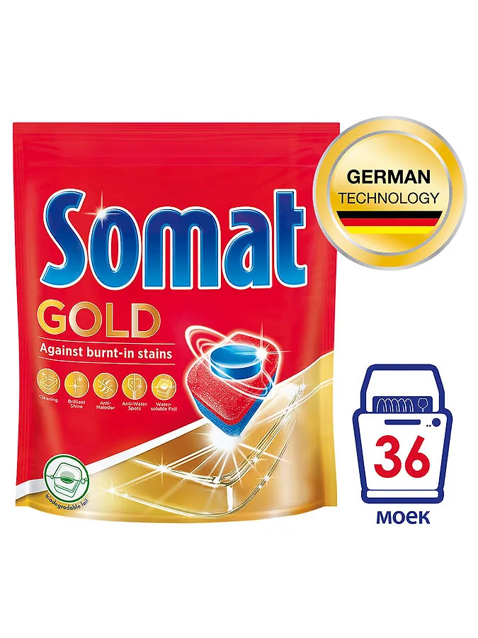 Таблетки для посудомоечной машины SOMAT Gold – это лучшая формула SOMAT! Благодаря эффекту замачивания они расщепляют остатки пищи и удаляют самые трудные загрязнения. Наш №1 против пригоревших загрязнений! Чистящая сила таблеток для посудомойки SOMAT Gold: эффективное очищение, против пятен от чая и кофе, быстрое растворение таблетки, функция ополаскивателя и соли, функция против жира, забота о посудомойке, действие при +40, функция против коррозии стекла.