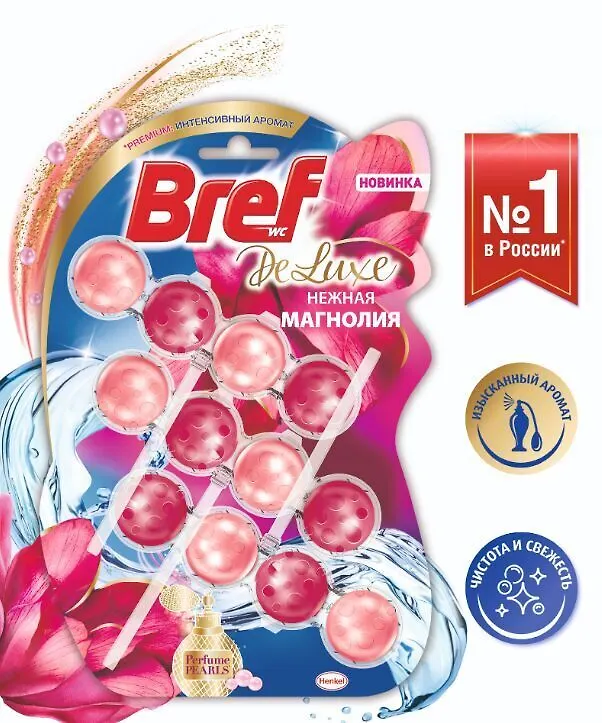 Хотите, чтобы в туалете был уникальный премиальный аромат? Инновация от Bref! Новый Bref DeLuxe представляет первый парфюмерный аромат для вашего туалета. Bref Deluxe обладает изысканным и элегантным ароматом и в то же самое время очищает и защищает от известкового налета. Новый туалетный блок Bref Deluxe представлен в премиальной запатентованной упаковке.