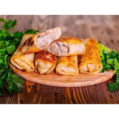 Разморозить блины и слегка обжарить с двух сторон на сливочном масле. Блинчики с рисом и мясом хорошо подавать к столу с говяжьим или куриным бульоном. Состав: тесто – молоко сухое, сыворотка, мука пшеничная, яйцо, сахар, масло растительное, соль; начинка – говядина, рис, лук репчатый, соль.