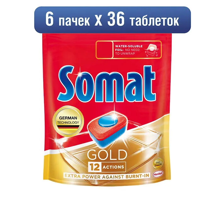 Таблетки для посудомоечной машины SOMAT Gold – это лучшая формула SOMAT! Благодаря эффекту замачивания они расщепляют остатки пищи и удаляют самые трудные загрязнения. Наш №1 против пригоревших загрязнений! Чистящая сила таблеток для посудомойки SOMAT Gold: эффективное очищение, против пятен от чая и кофе, быстрое растворение таблетки, функция ополаскивателя и соли, функция против жира, забота о посудомойке, действие при +40, функция против коррозии стекла.